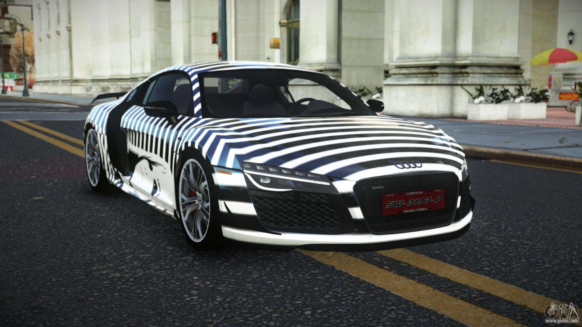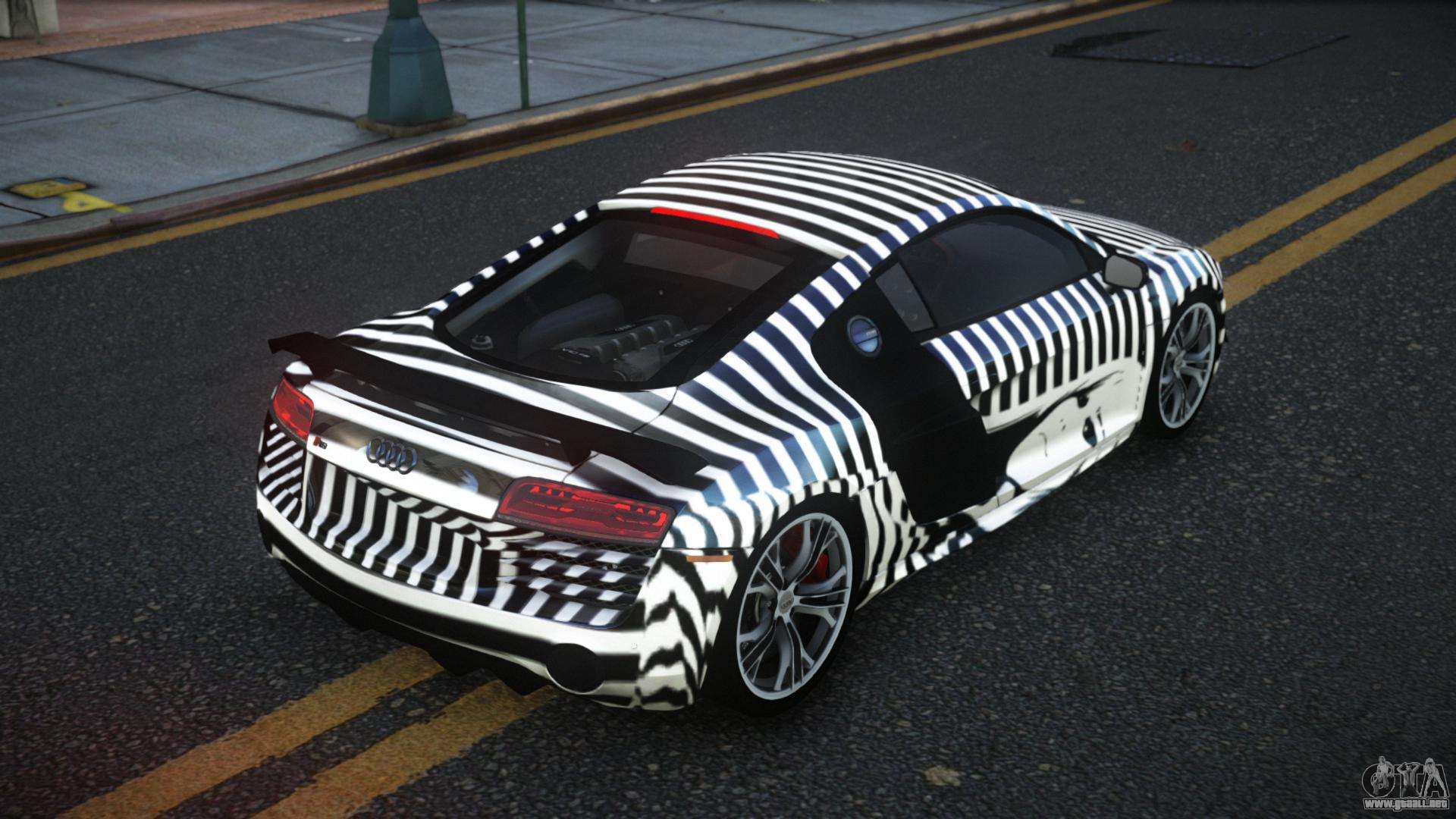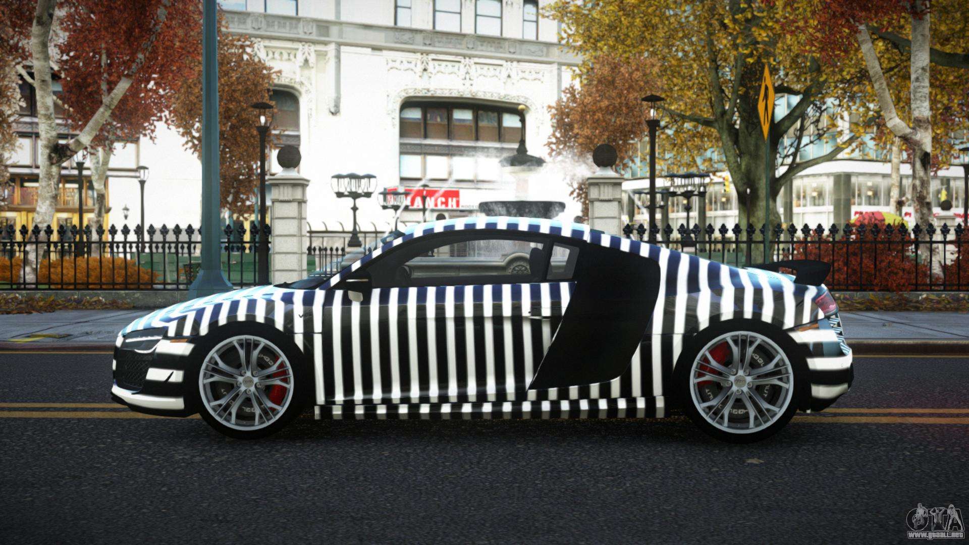 Puedes apreciar todo el encanto del coche descargando el Audi R8 Mican S12 mod para GTA 4 haciendo clic en los enlaces de abajo. El mod se instala automáticamente en dos clics, por defecto sustituye al Banshee, o elige cualquier otro vehículo del juego que quieras transformar.