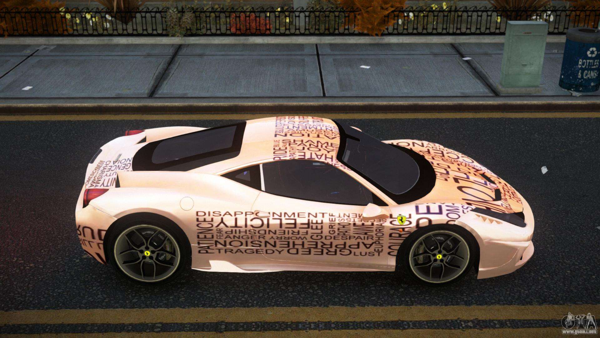 ¡Esto es lo que necesitas! Siga los enlaces a continuación para descargar Ferrari 458 Jenbel S8 mod para GTA 4 de forma gratuita. La configuración predeterminada es reemplazar el Banshee, o con la ayuda del mismo instalador puede reemplazarlo con cualquier transporte estándar.