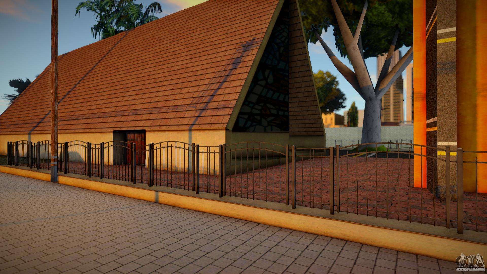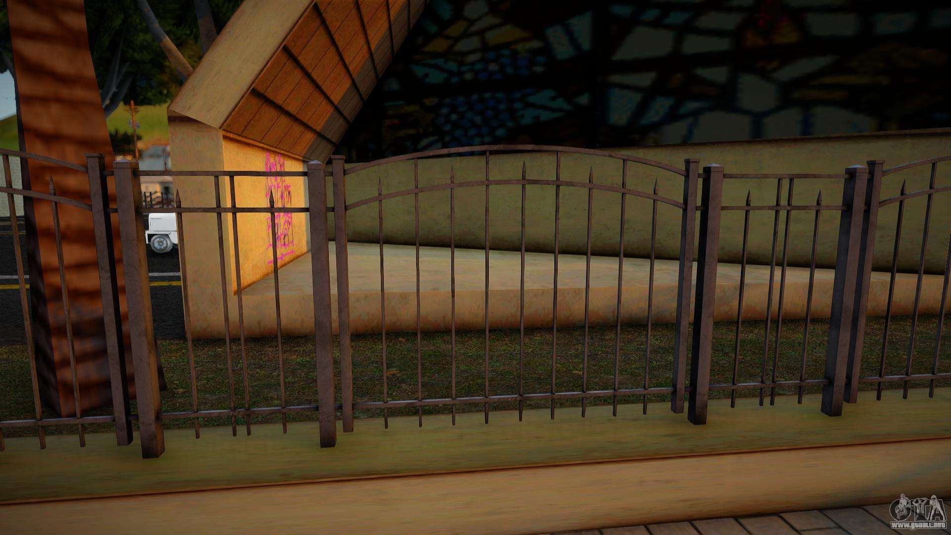 Mod de alta calidad - valla metálica HD 3D (actualizado) para GTA San Andreas. Las texturas que faltan han sido actualizadas. El mod reemplaza la valla alrededor de la iglesia cerca de la ubicación inicial por una textura de alta resolución con efecto volumétrico (en el original, solo era una textura con detección de colisiones).
